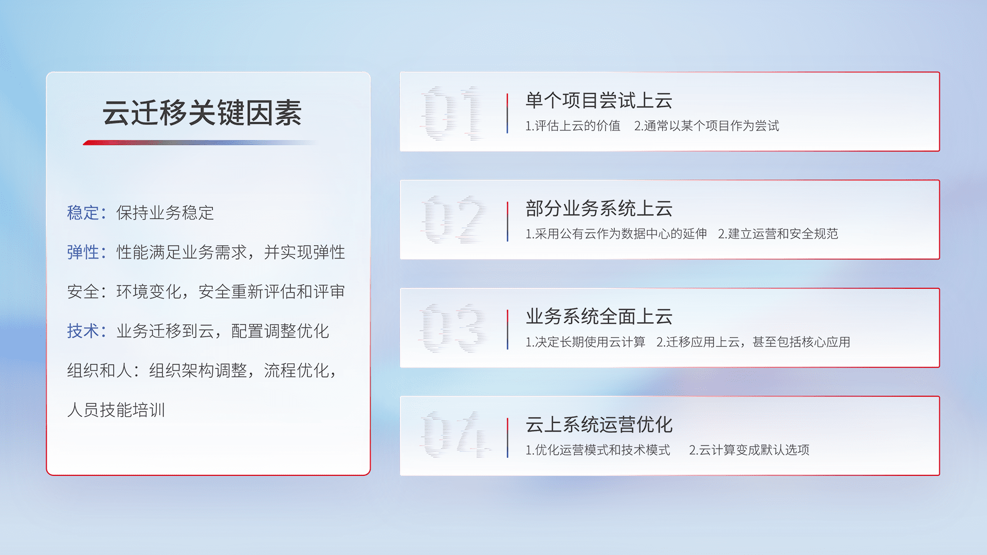 结合实际业务,,,从规划设计、、、、云平台选型、、、云原生改造、、数据迁移、、、、集成交付,,迁移全过程为客户识别最佳上云路径,,做好风险识别管理,,,,设计网络架构、、身份权限、、安全审计合规、、、操作审计、、日志审计、、、、监控告警策略、、多站点容灾设计等,,对云上基础设施进行整体规划,,提升IT治理水平,,以满足弹性、、高可用、、高性能的需求。。。